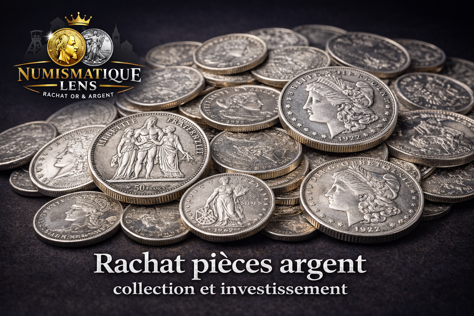 Rachat de pièces de monnaie en argent à Lens Le Comptoir Numismatique Lens, installé à Lens depuis plus de 21 ans, est spécialisé dans le rachat de monnaies en argent anciennes et modernes, françaises et étrangères. Nous achetons vos pièces en argent au meilleur prix, selon le cours de l’argent du jour ou leur valeur numismatique. Pièces en argent rachetées (liste non exhaustive) Nous rachetons notamment :