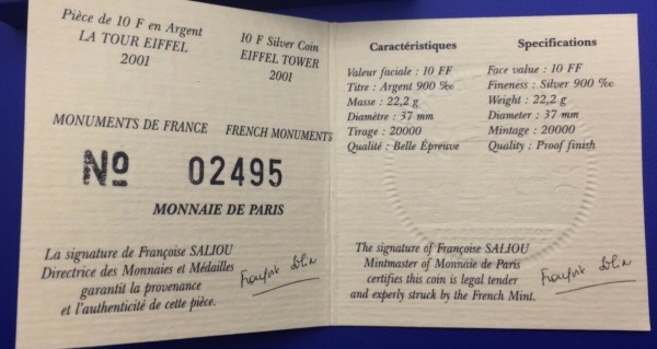 Monnaie France, BE 10 Francs 2001, Tour Eiffel, Coffret Monnaie de Paris